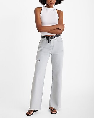 High Waisted Light Wash Ripped Raw Hem Wide Leg Jeans