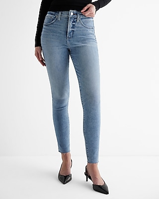 High Waisted Medium Wash Ripped Raw Hem Skinny Jeans