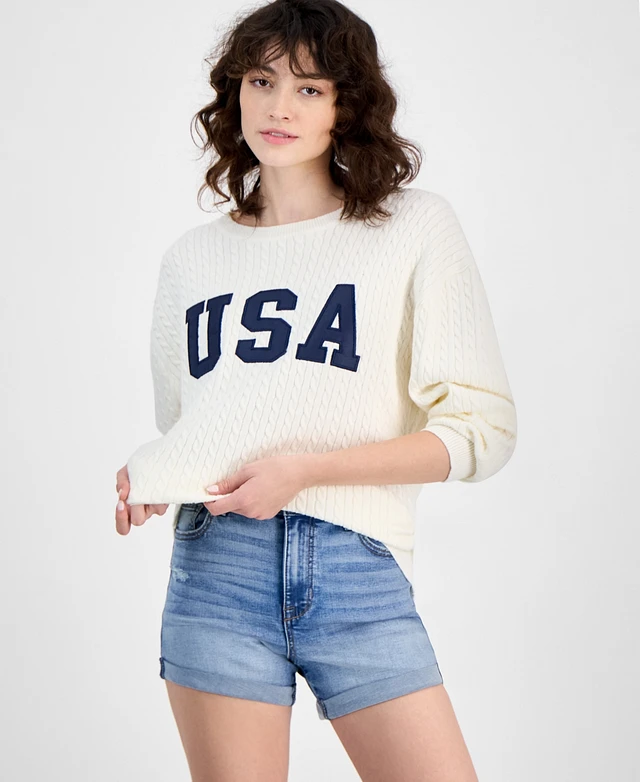 Hippie Rose Juniors' Cable-Knit Usa-Graphic Sweater