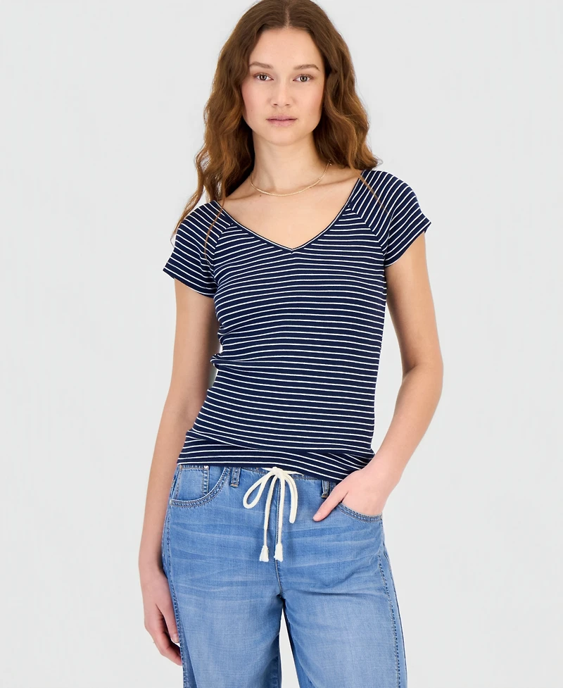 Classic stripes and a soft ribbed knit bring a timeless appeal to Hippie Rose's double V-neck top, making it a perfect pairing to your favorite jeans.