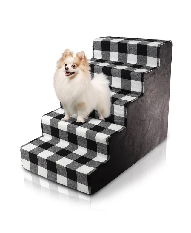 Home Base Dog Steps, 4-Step Design Pet Stairs for Small Dogs and Cats, Ramp for High Beds and Couch, Plaid, Soft, High Density Foam