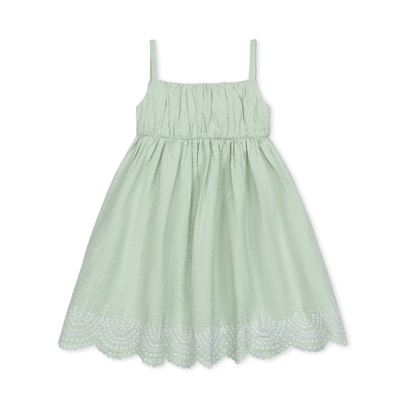 Subtle stripes feel sophisticated and fresh in our special party dress in organic cotton seersucker. Features a beautiful ruched bodice, detailed eyelet embroidery adorning a scallop edge hem, a full lining, and a zipper down the center back. This piece is part of our Created for Macy's collection.