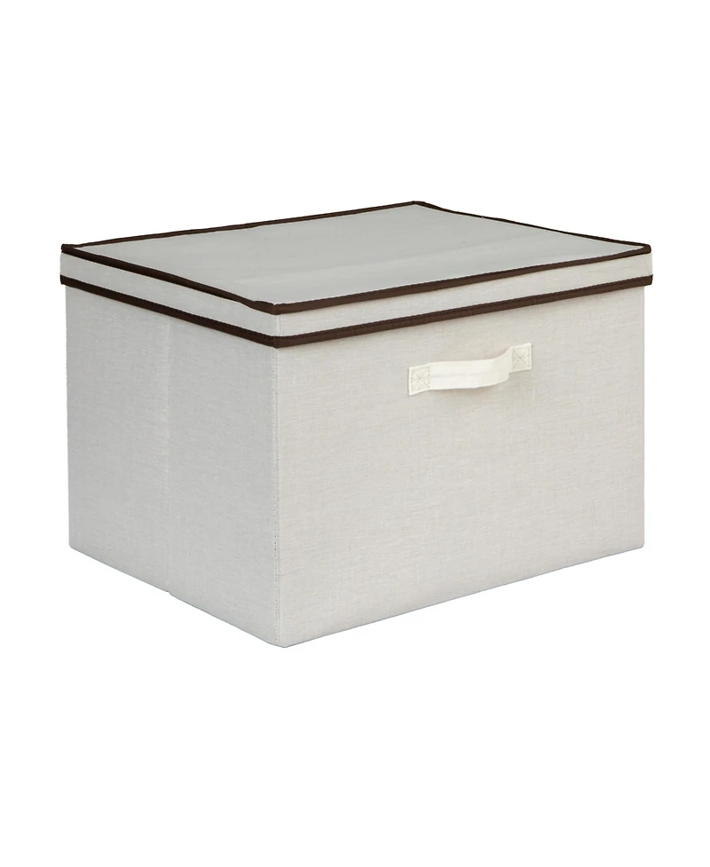 This sturdy and stylish storage box with lid provides limitless organizational functionality for your dressers, closets, basements, or home storage areas. Its timeless design, cream color, and fashionable brown fabric trim create an aesthetically pleasing alternative for plastic totes or old shoebox makeshift storage solutions designed to hide clutter. The storage container is made of a poly linen and is reinforced with solid siding for added stability, durability, and stackability. The canvas blend provides optimal protection from dirt, dust, cobwebs, moths, and other potentially damaging elements in your home, yet offers breathability so your woven items won t fall victim to stale or stuffy odors over time.