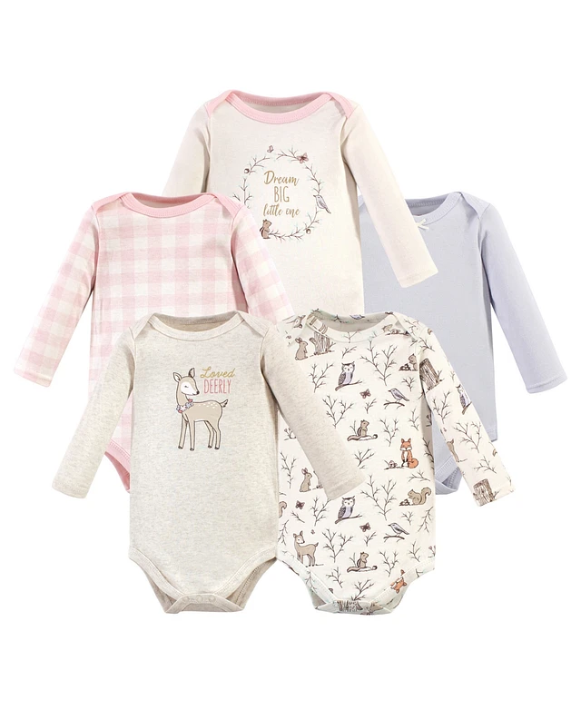 Hudson Baby Girls Cotton Long-Sleeve Bodysuits 5pk, Enchanted Forest, 6-9 Months