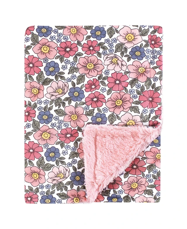 Hudson Baby Girls Plush Blanket with Furry Binding and Back, Pink Blue Pretty Floral, One Size