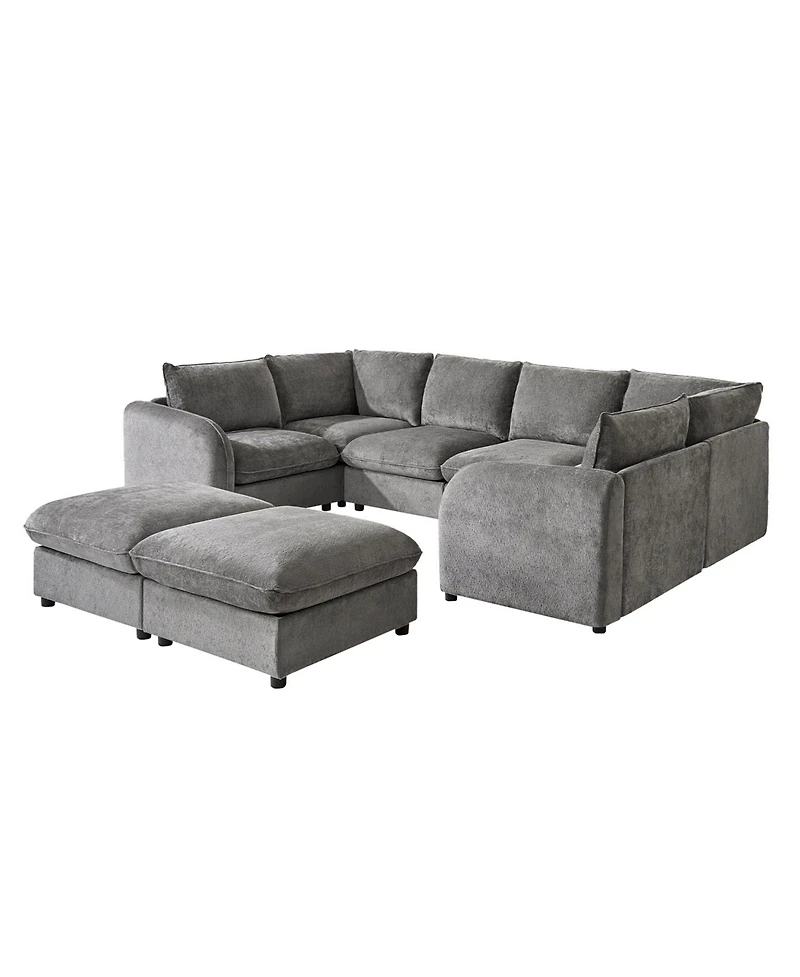This 6-seat modular sofa with 2 ottomans seamlessly combines comfort, functionality, and modern design, making it a versatile addition to any living room. Its wide seating modules offer ample space for relaxation, while the plush cushions and gently curved, thick armrests provide comfort and support.