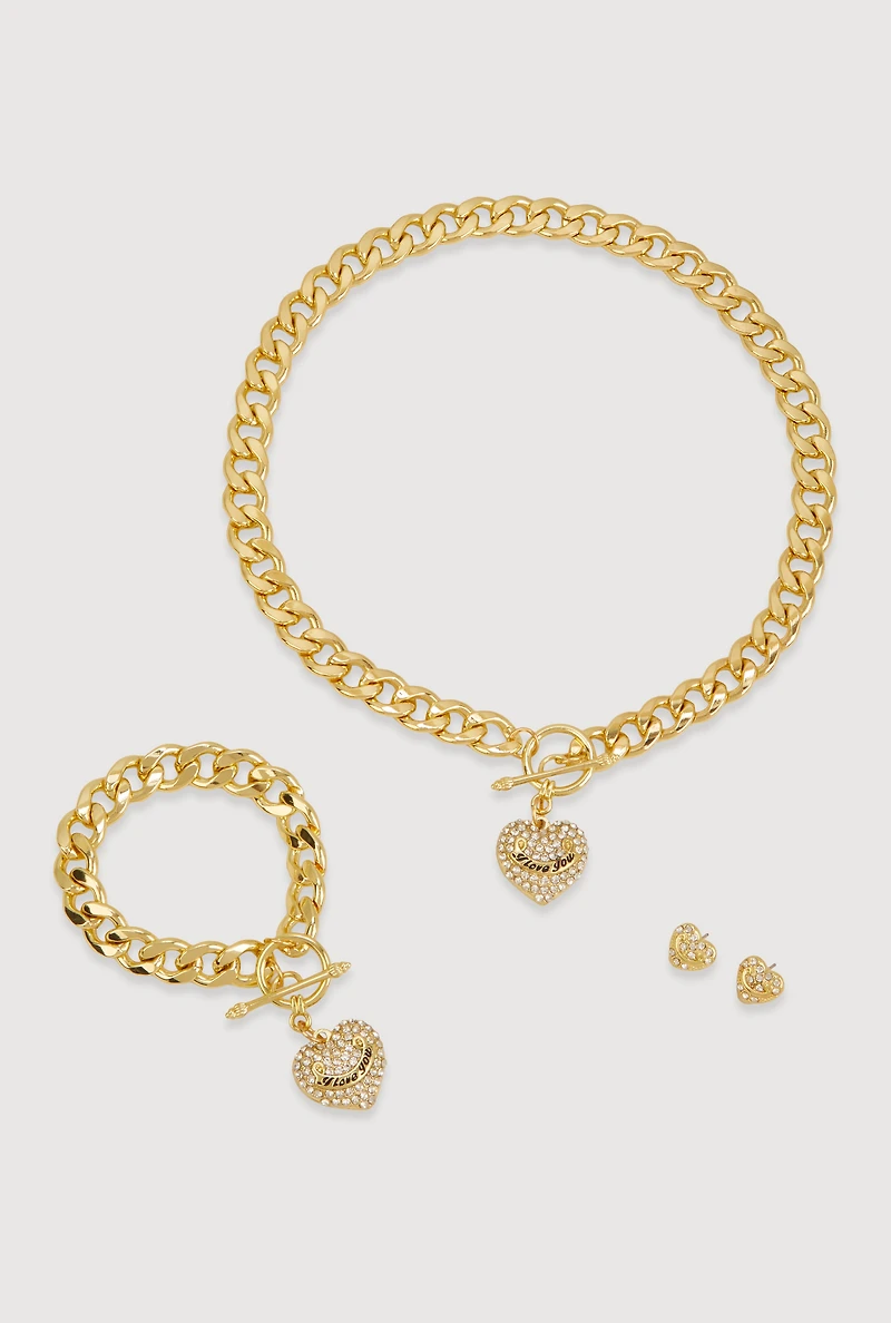 A sparkling jewelry set featuring a chunky chain necklace, matching bracelet, and stud earrings, each adorned with a "I Love You" heart-shaped charm detailed with rhinestones and a toggle closure. This set adds a bold yet elegant touch to any outfit, perfect for everyday wear or special occasions.