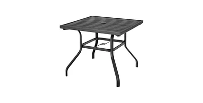 This outdoor table is built with a heavy-duty metal frame and hand-woven Pe rattan, supporting up to 165 lbs for long-lasting durability. Featuring a 2"" umbrella hole, it offers shaded comfort. With a faux wood tabletop, it suits any outdoor decor, is portable, and includes anti-scratch foot pads. Easy assembly and maintenance ensure hassle-free use.