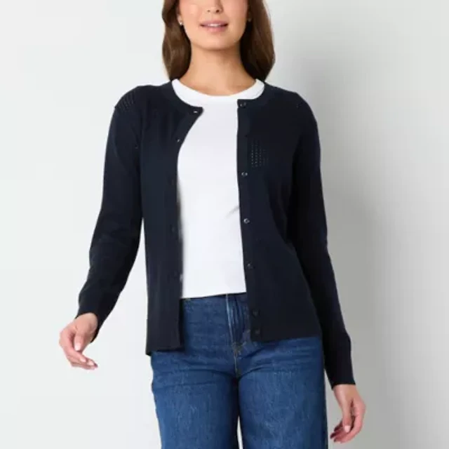 IZOD Womens Round Neck Long Sleeve Button Juniors Cardigan