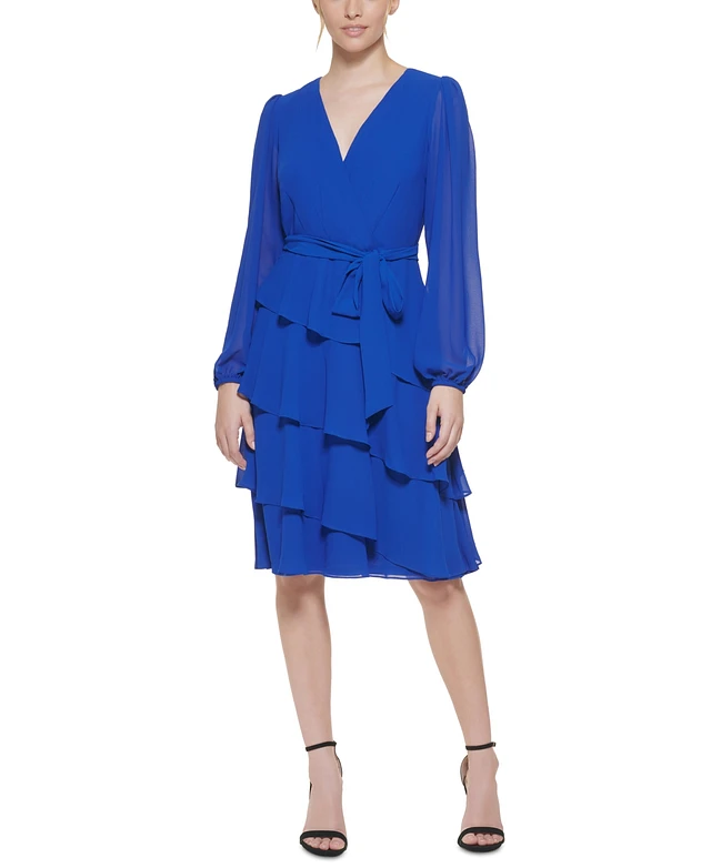 Jessica Howard Petite Blouson-Sleeve Tiered Chiffon Fit & Flare Dress