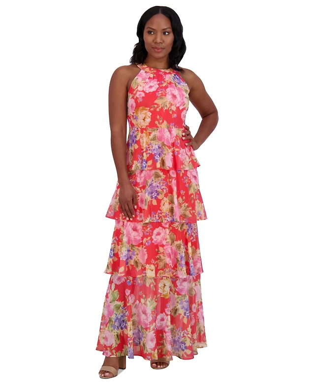 Jessica Howard Petite Floral-Print Tiered Halter Gown