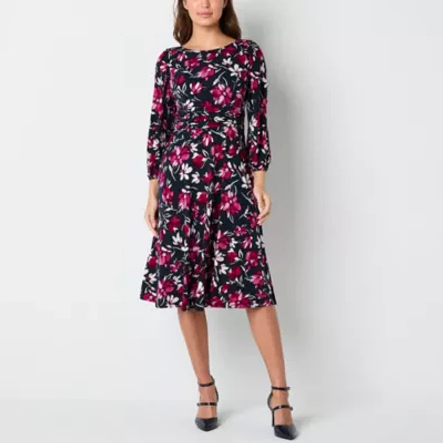Jessica Howard Womens 3/4 Sleeve Floral Midi Fit + Flare Dress