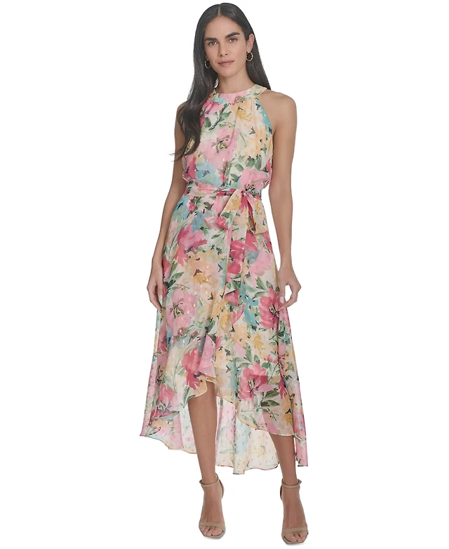 Jessica Howard Women's Floral Chiffon Tie-Waist High-Low Midi Dress