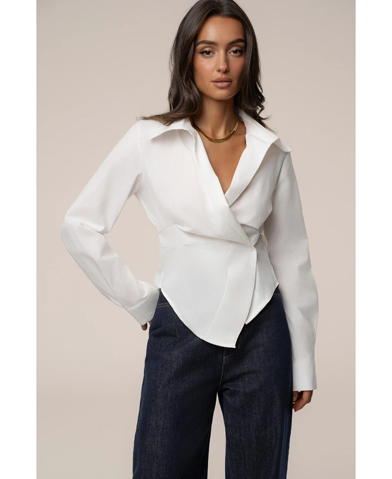 Redefine your wardrobe essentials with the Olive Sculpt And Form Blouse. This crisp, long-sleeved design features an asymmetric front enhanced by a refined button closure. A V-shaped hem creates a sculptural effect, accentuating a fitted silhouette. Perfect for transitioning seamlessly from the office to an elegant evening out.