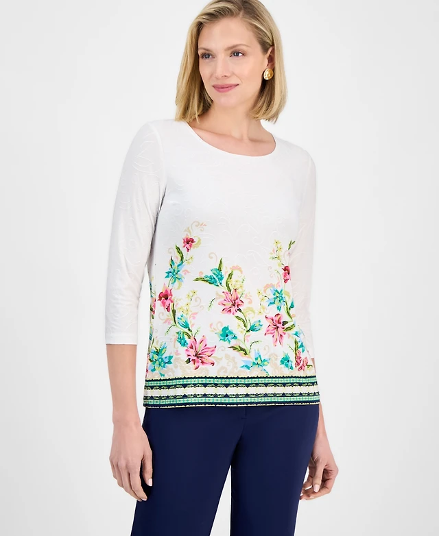 Jm Collection Women's Printed Jacquard 3/4-Sleeve Top, Exclusively at Macy's