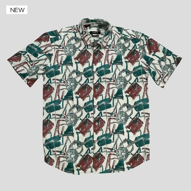 Camisa Johnny Q de manga corta, diseñada para el hombre que busca un look moderno y diferente. Su estampado abstracto en tonos verdes y vino aporta personalidad y sofisticación, ideal tanto para ocasiones casuales como para salidas semi-formales.