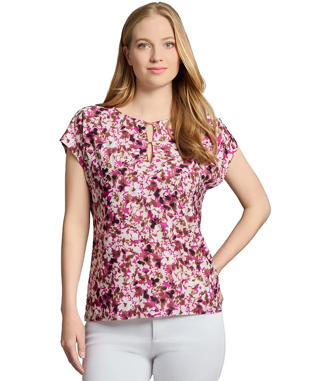 Jones New York Petite Floral-Print Keyhole Cap-Sleeve Top