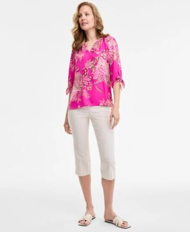 Jones New York Womens Paisley Print Tie Sleeve Blouse Pull On Cropped Stretch Capri Pants