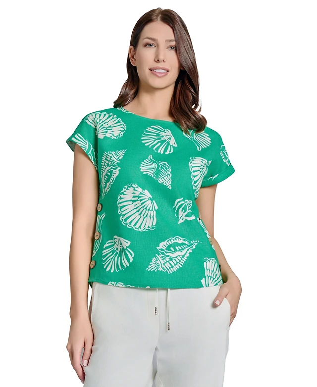 Jones New York Women's Printed Linen-Blend Button-Trim Blouse