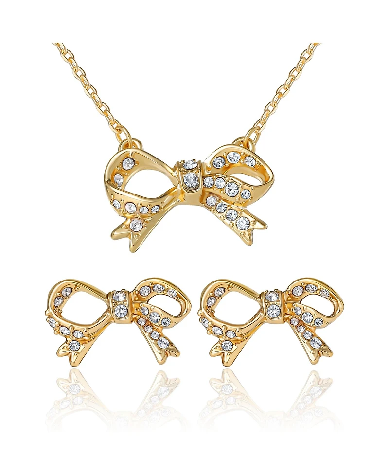 The sweetest set. A sparkling pave bow pendant necklace pairs with matching stud earrings to tie every look together. Delicate yet eye-catching, the set is perfect for gifting-think birthdays, showers or bridesmaids. Necklace adjusts with an extender studs feature secure post backs.