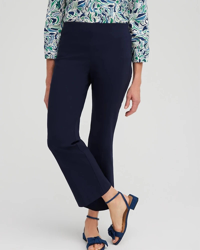 - Classic fit; slim stretch, pull-on, faux back pockets, crop length, flare leg, So Slimming® 180.