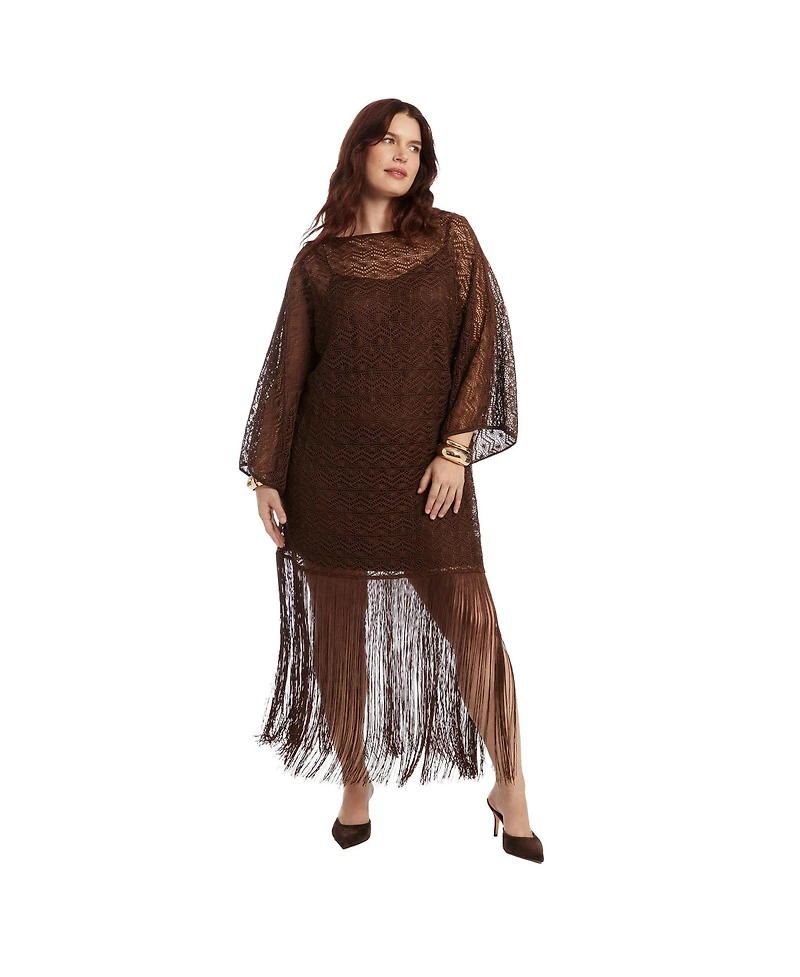 Every thread tells a story in this romantic lace wrap dress, finished with a playful fringe hem that moves with effortless grace. Blending bohemian spirit with refined drama, it s a true love letter to lace, light, and legacy. Designed to float and sway with every step you take. The relaxed silhouette drapes beautifully, complemented by an elegant boat neckline for timeless sophistication, while a soft slip lining provides comfortable coverage beneath the intricate braided lace. The fringe hem falls to a sweeping maxi length, measuring 57.5 inches to the longest point of fringe and 38.5 inches to the lining (based on size 18/20), creating a layered effect that highlights its cascading movement. Crafted from 100% polyester braided lace. Machine wash cold on a gentle cycle with like colors. Use only non-chlorine bleach when needed. Do not tumble dry. Lay flat to dry. Cool iron as needed.