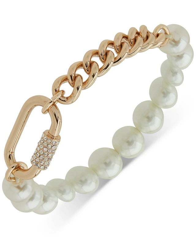 Karl Lagerfeld Paris Gold-Tone Pave Carabiner Imitation Pearl Stretch Bracelet