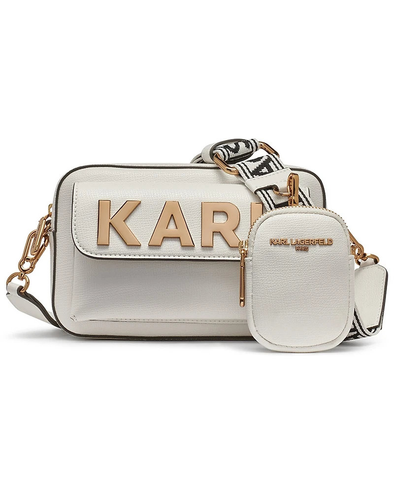 Add a touch of flair to your outfit with the crossbody bag by Karl Lagerfeld Paris featuring playful Karl pins, complete with an adjustable strap for the perfect fit.