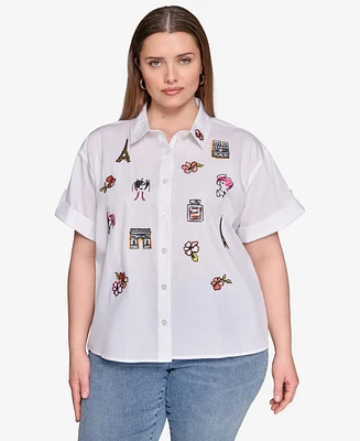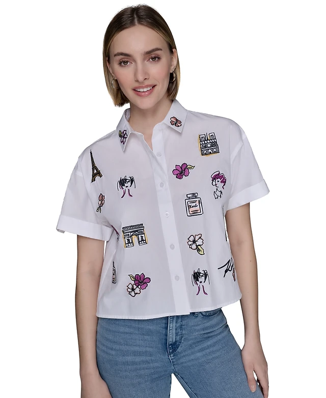 Karl Lagerfeld Paris Petite Cotton Embroidered Short-Sleeve Shirt