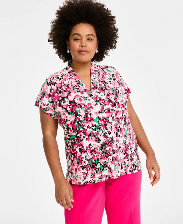 Kasper Plus Printed V-Neck Cap-Sleeve Blouse