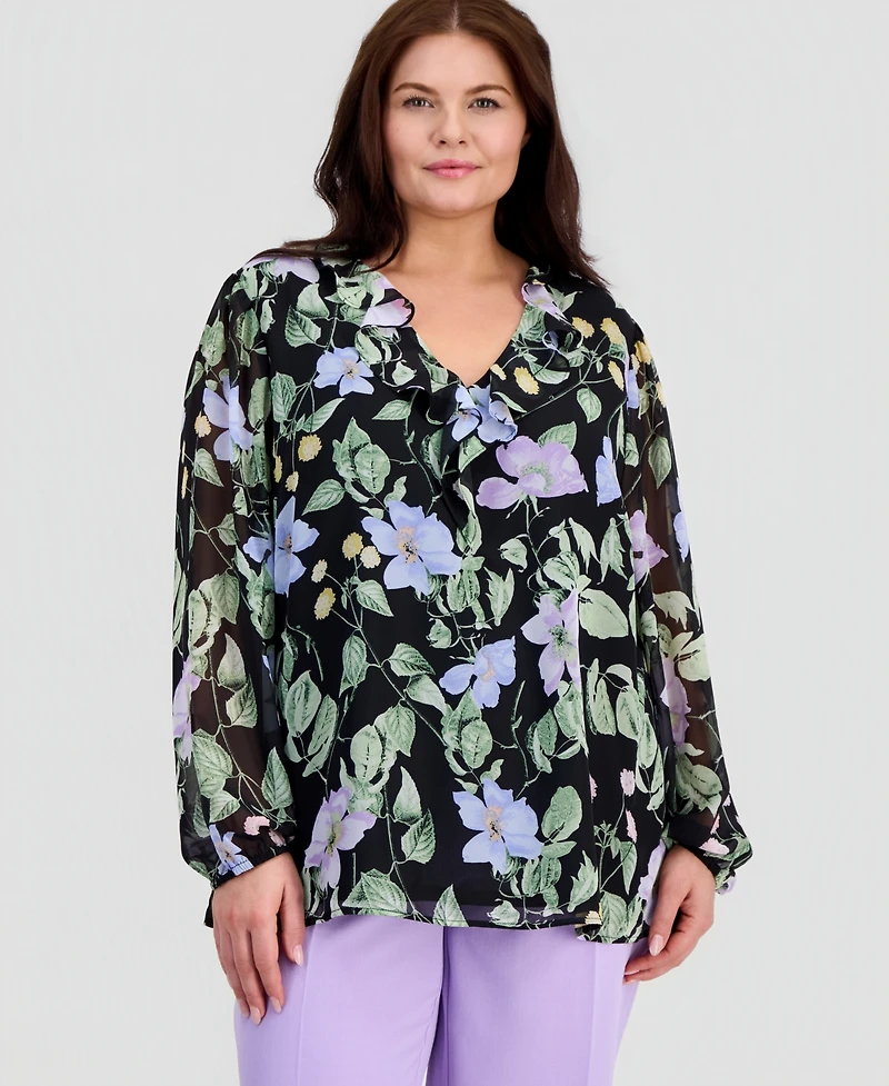 Kasper Plus Ruffled V-Neck Chiffon Blouse
