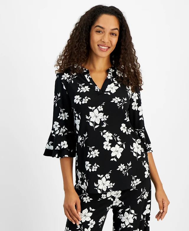 Kasper Women's Printed Ruffle-Sleeve Blouse, Regular & Petite