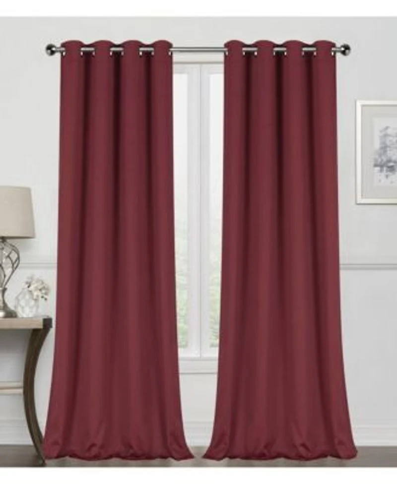 Bring rich color and dependable comfort to your home with the Kate Aurora Burgundy Red 2 Piece Grommet Top Blackout Curtain Panels for Extra Long Windows. Designed to enhance taller windows with graceful coverage, these elegant panels add bold burgundy red tones while delivering reliable light control and privacy. Blackout fabric helps block unwanted sunlight and reduce outside noise, making them ideal for bedrooms and living spaces. The thicker construction supports a darker environment for restful sleep and helps insulate against heat and cold for year round comfort. Each set includes two extra long panels with durable metal grommets that slide smoothly onto standard curtain rods for quick installation and even folds. Durable easy care material is made for daily living. Perfect for creating a warm polished look in any room.