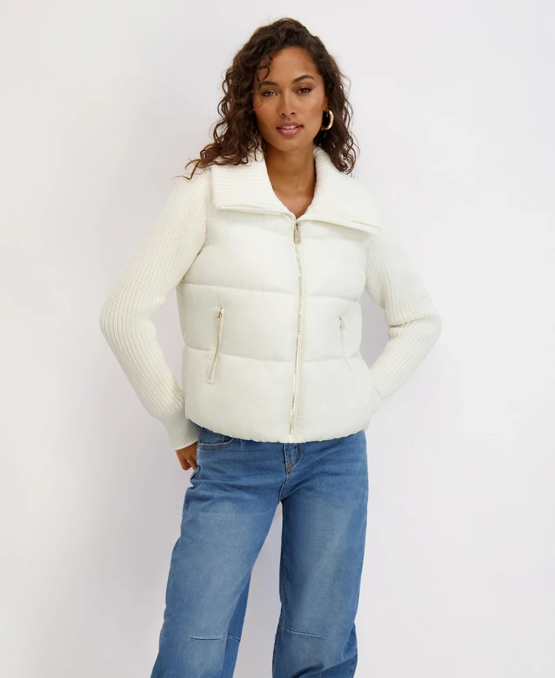 Kensie Women's Mixed Media Short Puffer with Knit Sleeves & Collar