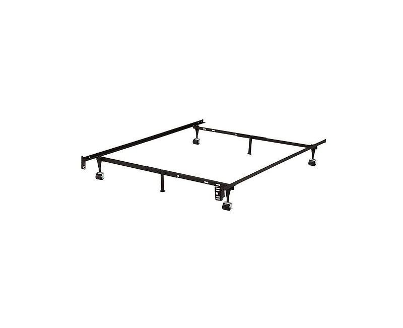 This bed frame is a strong and versatile option for supporting your mattress. The frame is made of heavy-duty steel rails and is easily extendable to fit twin, full, or queen sizes. Six legs hold up this frame, four of which have thick rolling wheels for smooth movement. Two of the wheels lock to immobilize the frame in place. Headboard attachment is made easy with the included two headboard brackets.