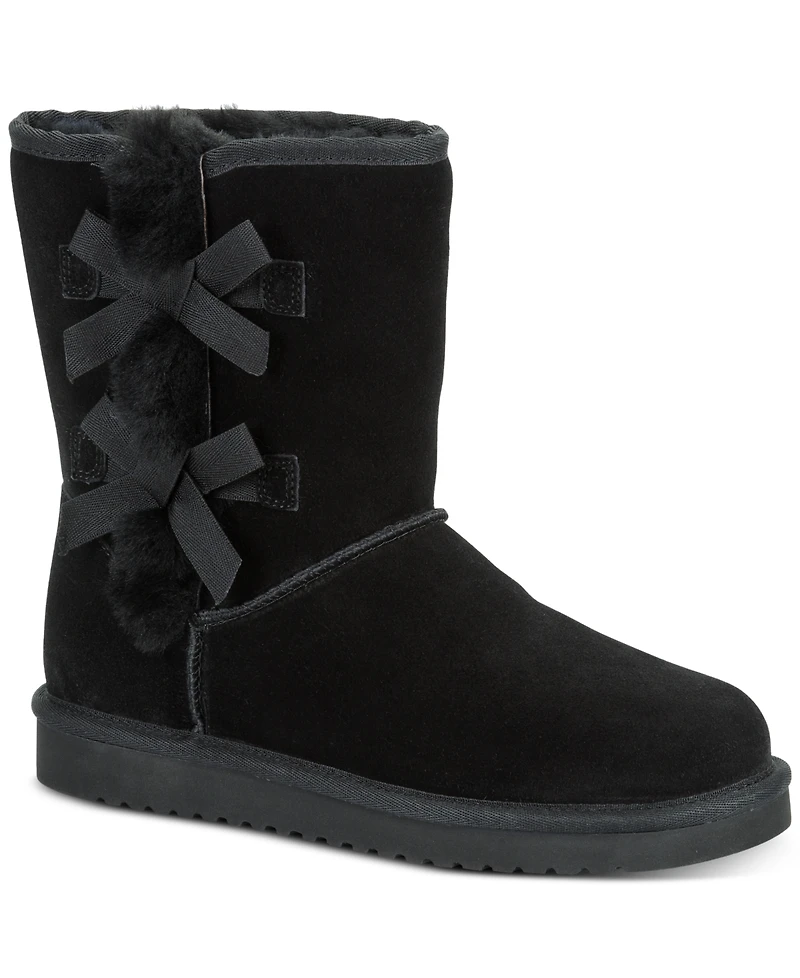Genuine sheepskin and faux-fur fluff is the stuff of cozy walking in the Koolaburra By Ugg Victoria short boots featuring spill-over chill-chasing trim secured in cute bows.