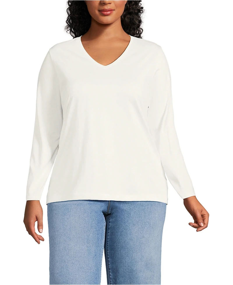 Looking for that new favorite top you can wear just about anywhere all year long? Look no further than the Lands End Women s Relaxed Supima Cotton Long Sleeve V-neck T-shirt. Offered in extended sizes Lands End dresses women in the clothing they need to look and feel their best day after day. Made from ultra-soft Supima cotton this shirt is light never bulky and breathable enough to layer under sweaters jackets and fleece but thin enough to wear over turtlenecks and tank tops.