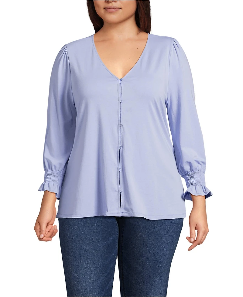 Lands' End Women's Plus 3/4 Sleeve Lightweight Jersey Button Front Top