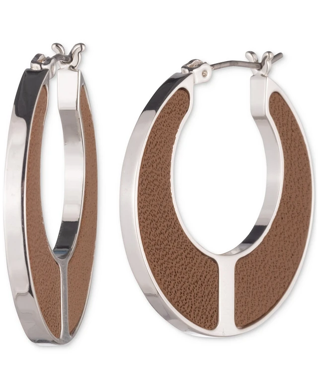 Lauren Ralph Lauren Silver-Tone Brown Leather Medium Hoop Earrings, 1.2"