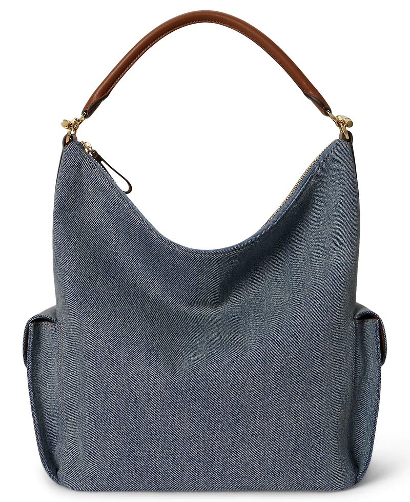 Blend casual and refined style with this Lauren Ralph Lauren Blaike shoulder bag, crafted from washed denim with supple full-grain leather trim. A relaxed, spacious silhouette and exterior pockets offer easy access to essentials, while Lrl engraved toggle hardware on the strap adds a signature touch.