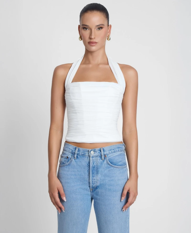 This halter corset top features ruched detailing with internal structured boning that sculpts and supports while the halter neckline delivers a shapely lifting effect from every angle.