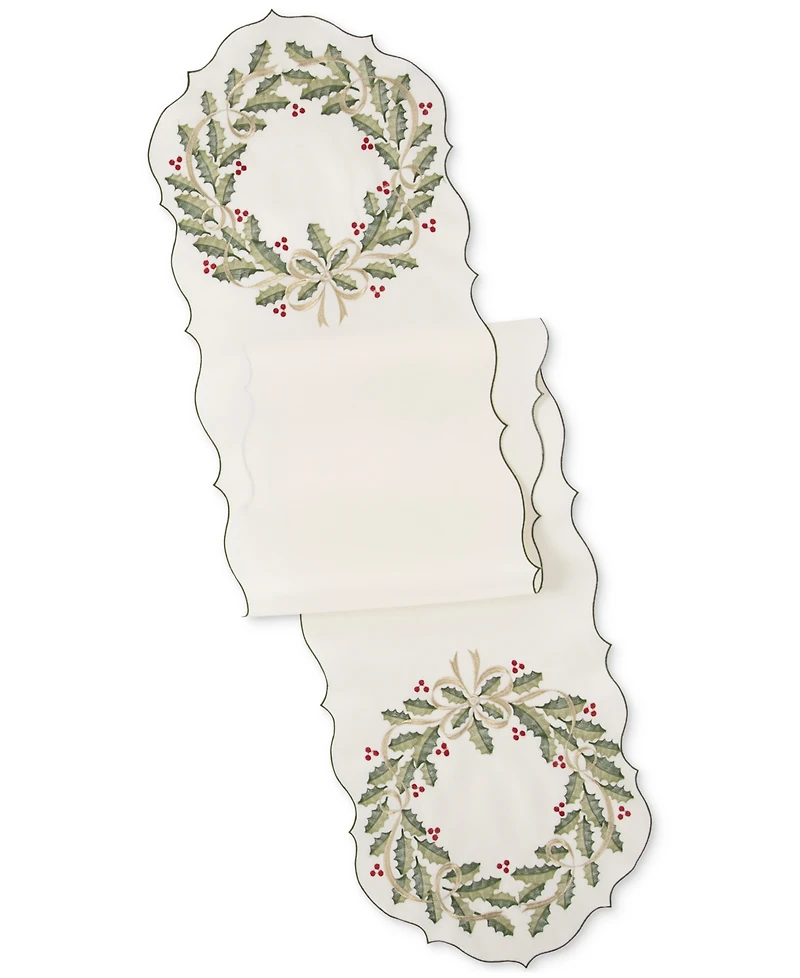 A charming addition to the festivities, Lenox's Holiday Nouveau Wreath table runner boasts a sophisticated combination of holly and ribbon motifs on creamy white polyester. Edges feature detailed embroidery and scalloped cutwork for a design that's perfect for seasonal gatherings.