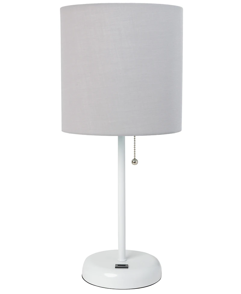 This fun and fashionable lamp features a brushed steel base and a fabric shade. It comes equipped with a Usb seated in the base for use to charge mobile phones, handheld games, tablets, and other small electronics.