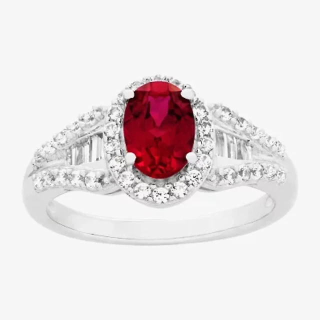 Limited Quantities! Womens Lab Created Red Ruby Sterling Silver Oval Halo Side Stone Cocktail Ring