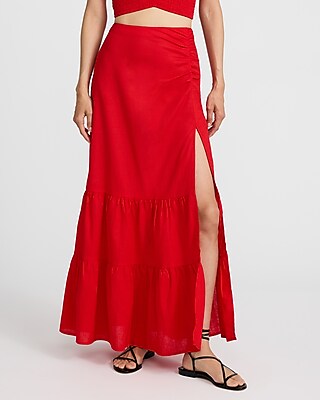 Linen-Blend High Waisted Ruched Tiered Maxi Skirt