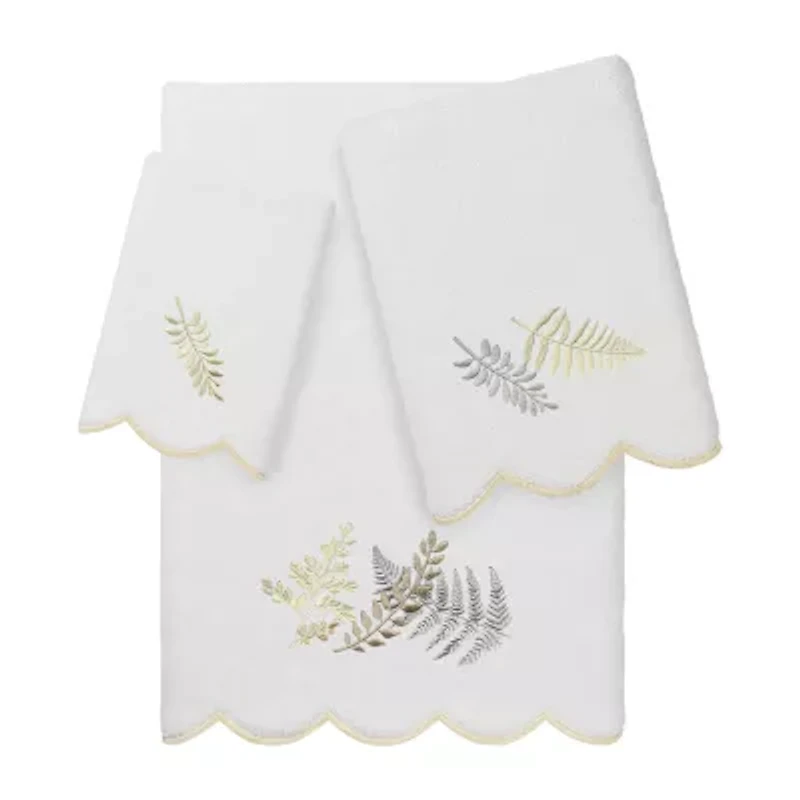 Add a fresh spirit to your bath with the FERN TOSS Scallop Embellished Towel Collection. These towels feature delicate embroidered fern motifs with sparkling highlights and scalloped embroidered bottom edge. These soft and luxurious towels are made of 100% premium Turkish cotton and offer lasting absorbency and superior durability. This collection is available in 5 lovely colors: white/beige, white/green, white/blue, white/pink, and white/gray. The FERN TOSS Scallop Towel Collection brings color and richness to your decor and makes a great gift.