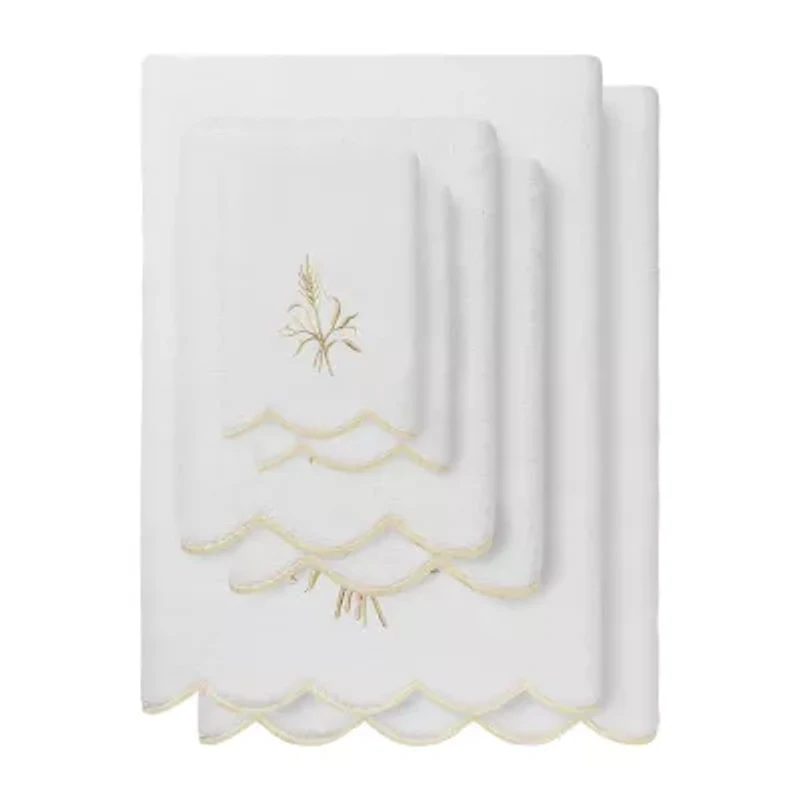 Create a mood of vintage charm in your bath with the WHITNEY Scallop Embellished Towel Collection. These towels feature an intricate embroidered wheat bouquet with sparkling accents and scalloped embroidered bottom edge. Cloud soft and super absorbent, these 100% premium Turkish cotton towels are luxurious and durable. This collection is available in 5 lovely colors: white/beige, white/green, white/blue, white/pink, and white/gray. The WHITNEY Scallop Towel Collection adds a sweet spirit and richness to your decor and makes a great gift.