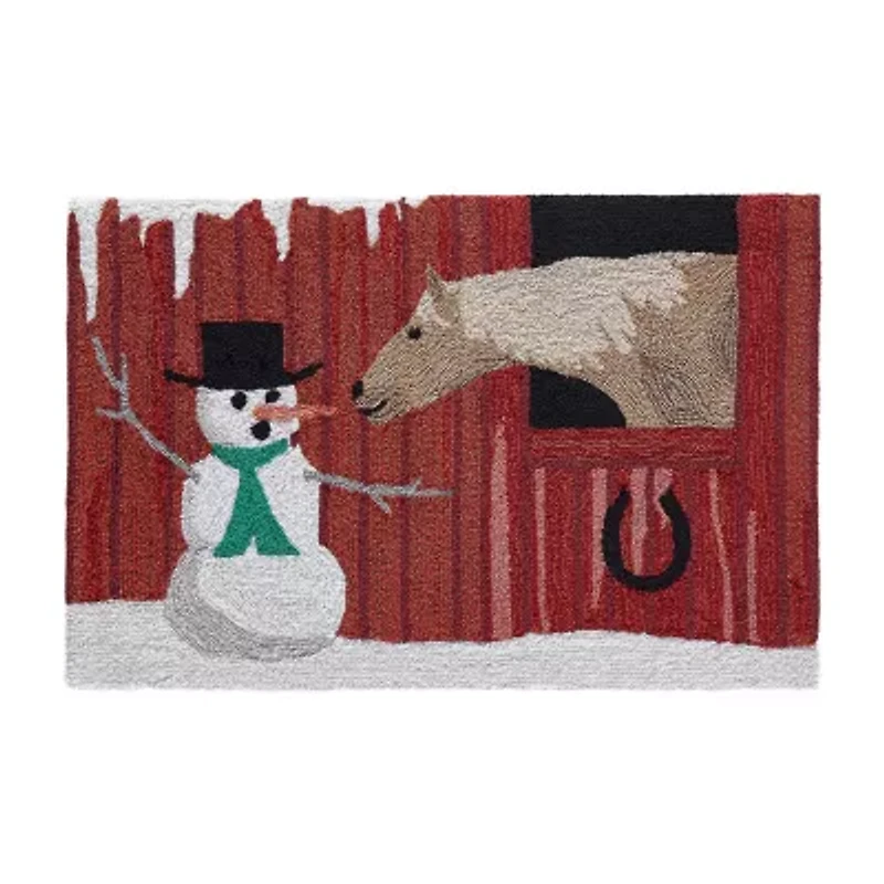 This hand hooked mat features a whimsical holiday vignette; a rustic burgundy red barn capped by snow serves as a background are accented by a horse about to snack on a snowman's carrot nose. This happy scene makes this mat the perfect accent to welcome guests at your door, at your kitchen sink, or in any space inside or outside your home. Made in China from a polyester/acrylic blend, the Frontporch Collection is hand tufted to create detailed designs with intricately blended colors for a high-quality finish. The material is hand hooked to create both softness and durability with weather resistant and added fade resistant treatment that is remarkably easy to clean. These pieces are perfect for you patio, entryway, bathroom, laundry room and kitchen making this the ideal indoor or outdoor rug. Fun, casual and unique these vibrant, crisp and detailed patterns range from coastal, farmhouse, novelty sayings, pets and traditional designs to perfectly accent your home. Limiting exposure to rain, moisture and direct sun will prolong rug life.