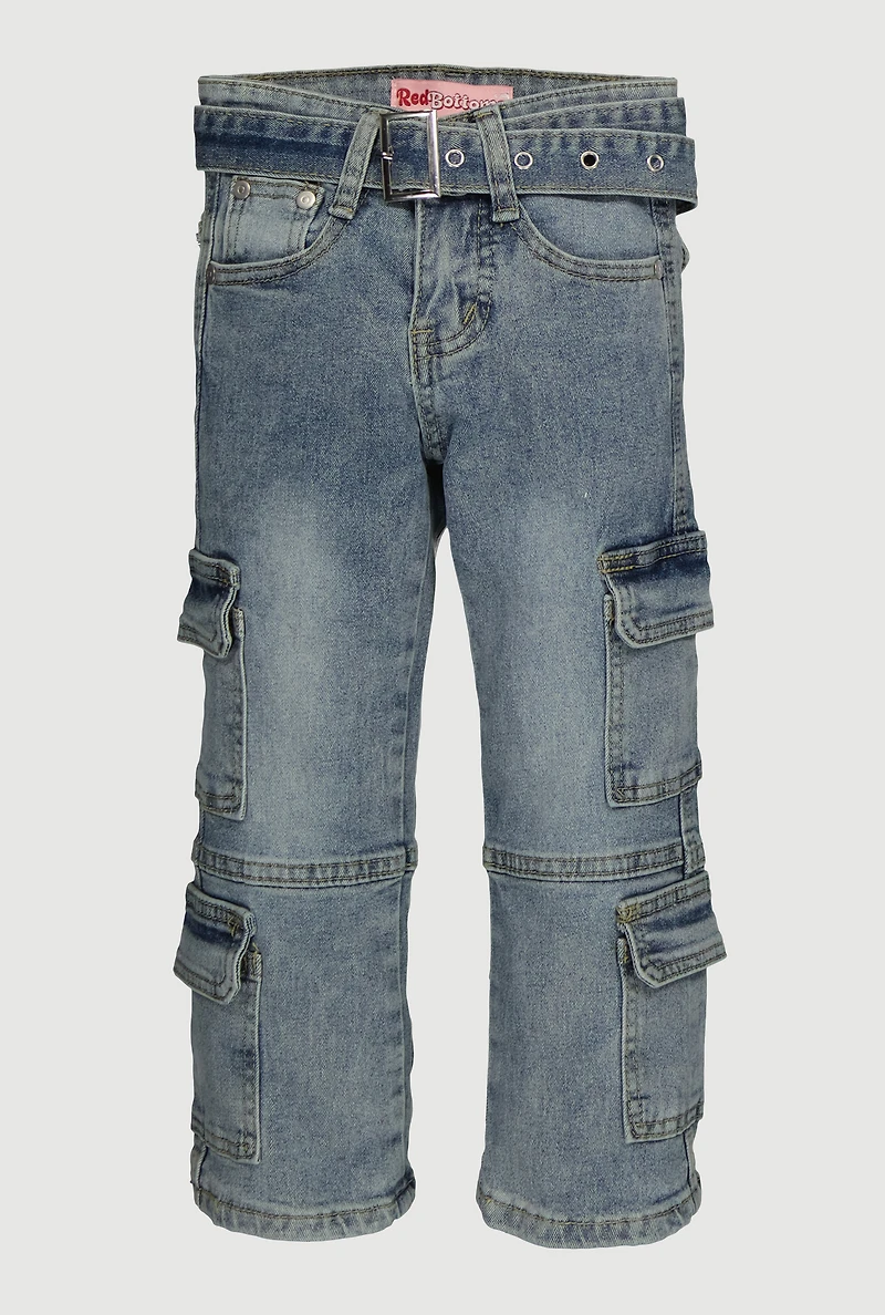 Rock that effortlessly cool vibe with these Little Girls Acid Wash Mid Rise Straight-Leg Jeans. Perfect for everyday adventures, these jeans bring together classic denim durability and trendy acid wash flair. The mid rise fit keeps comfort front and center, while the straight-leg cut offers a timeless silhouette that pairs with everything from tees to hoodies. With functional cargo pockets and a stylish belt included, these jeans are ready to take your little one from playdates to street style moments with ease.
