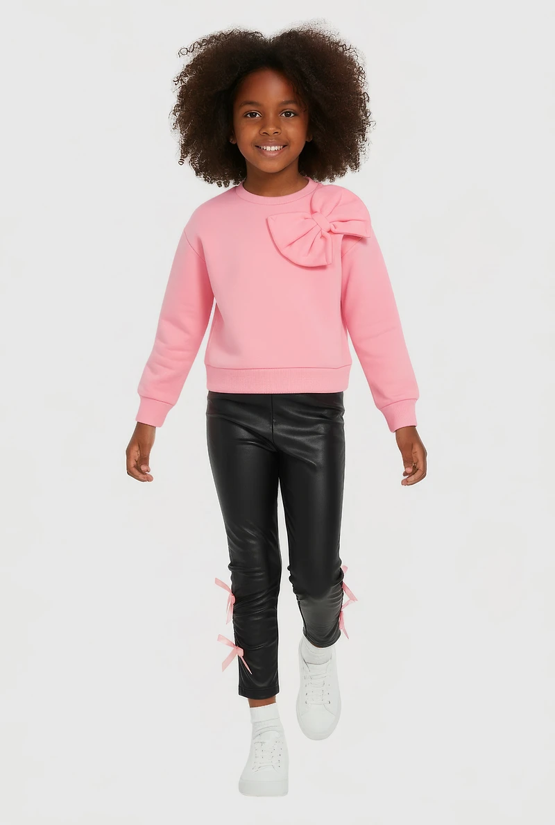Little Girls Bow Sweatshirt and Faux Leather Ruched Leggings